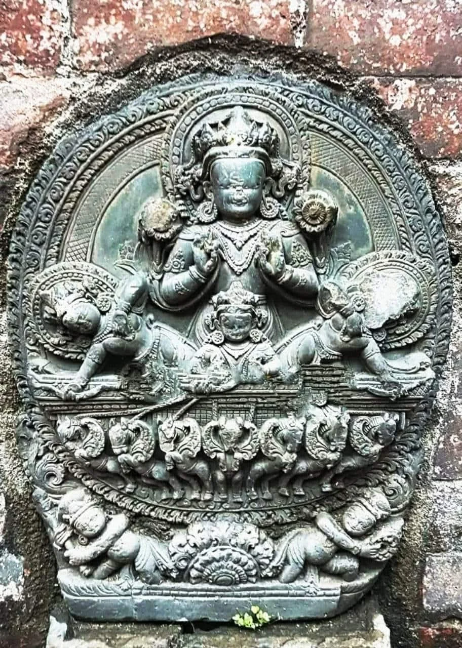 This is a Malla dynasty stone sculpture of the Hindu Sun God, Surya, riding his chariot. It is located near a traditional water spout in the Dattatraya area of Bhaktapur, Nepal.