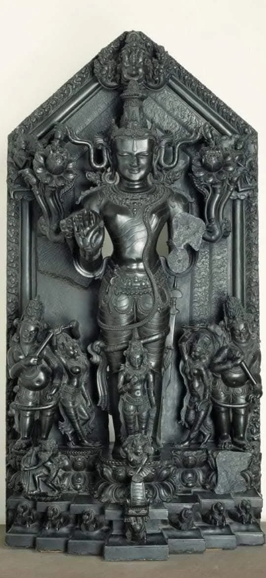 This specific sculpture of Sun God ( Surya) is currently housed in the Victoria and Albert Museum in London. The sculpture is from the Pala Empire in Eastern India (12th century AD) specifically Bihar or Bengal. Surya holds lotus tendrils, and is flanked by his consorts and attendants, including Danda and Pingala.