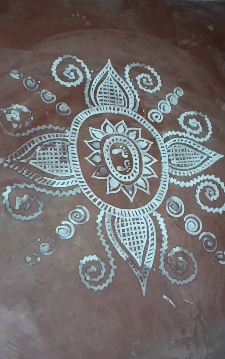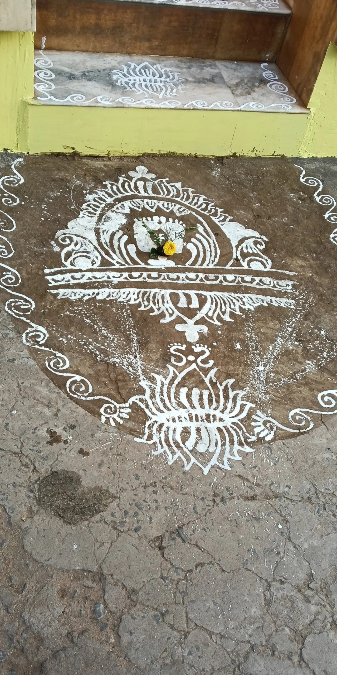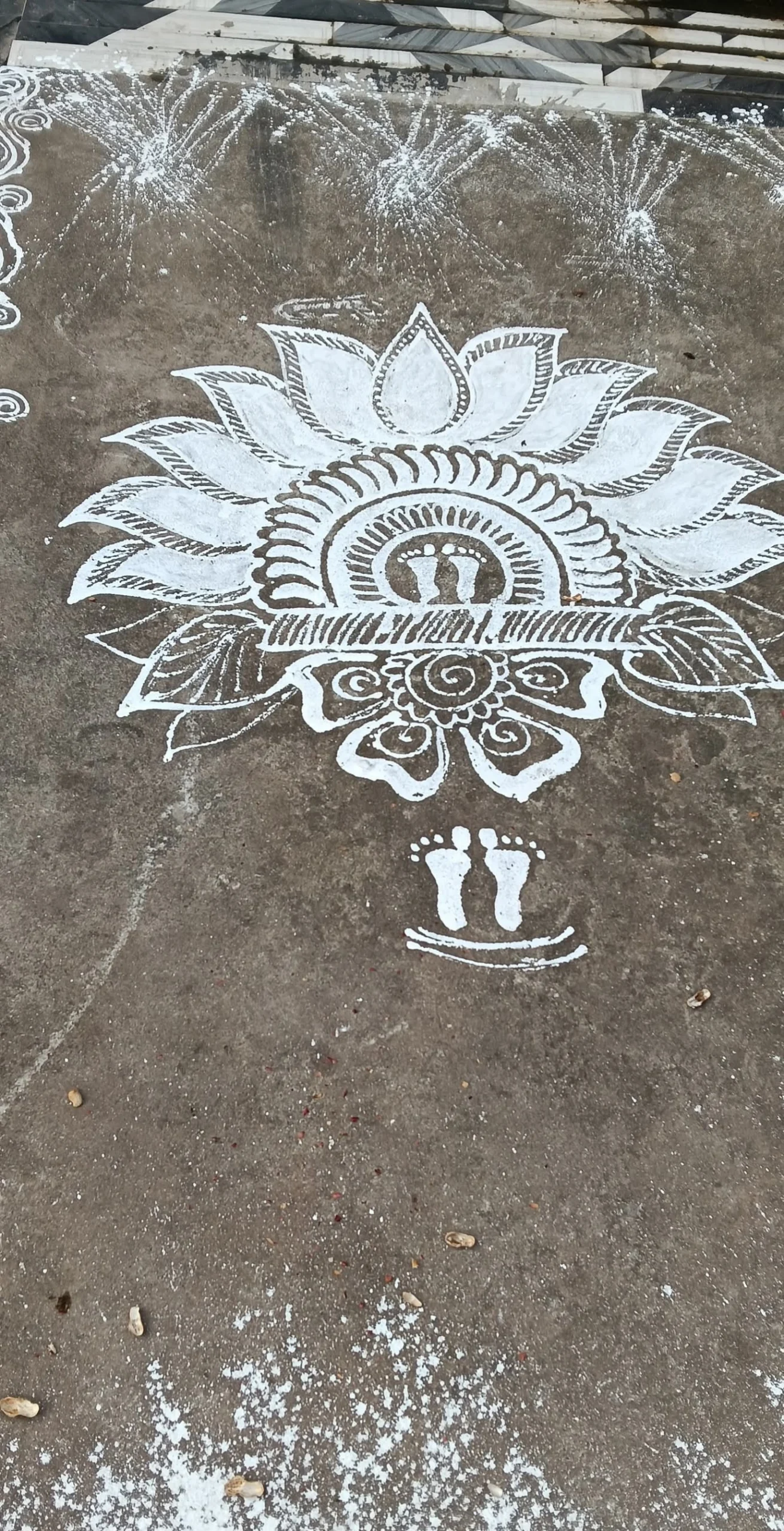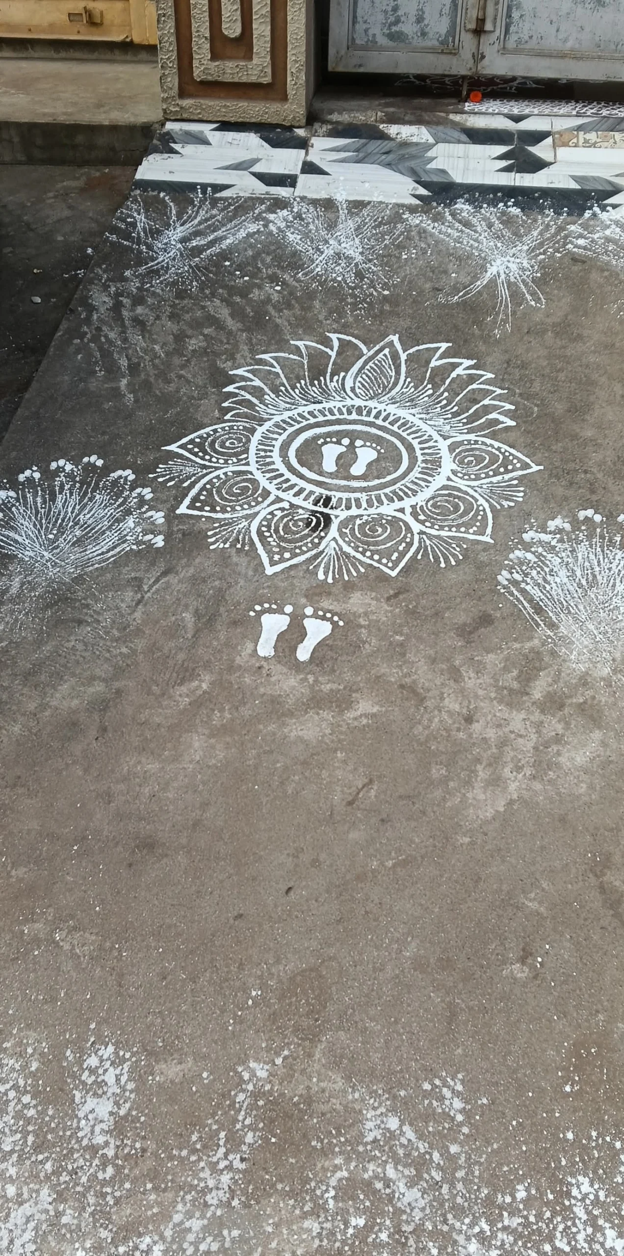 Goddess Lakshmi is related with virtue, opulence, excellence and promise. Her footprints connote an unadulterated and purified space . The drawings of Lakshmi feet liberates the home from negative energies. It is believed that drawings of Goddess Lakshmi feet in the entrance brings glory and prosperity to the householder.