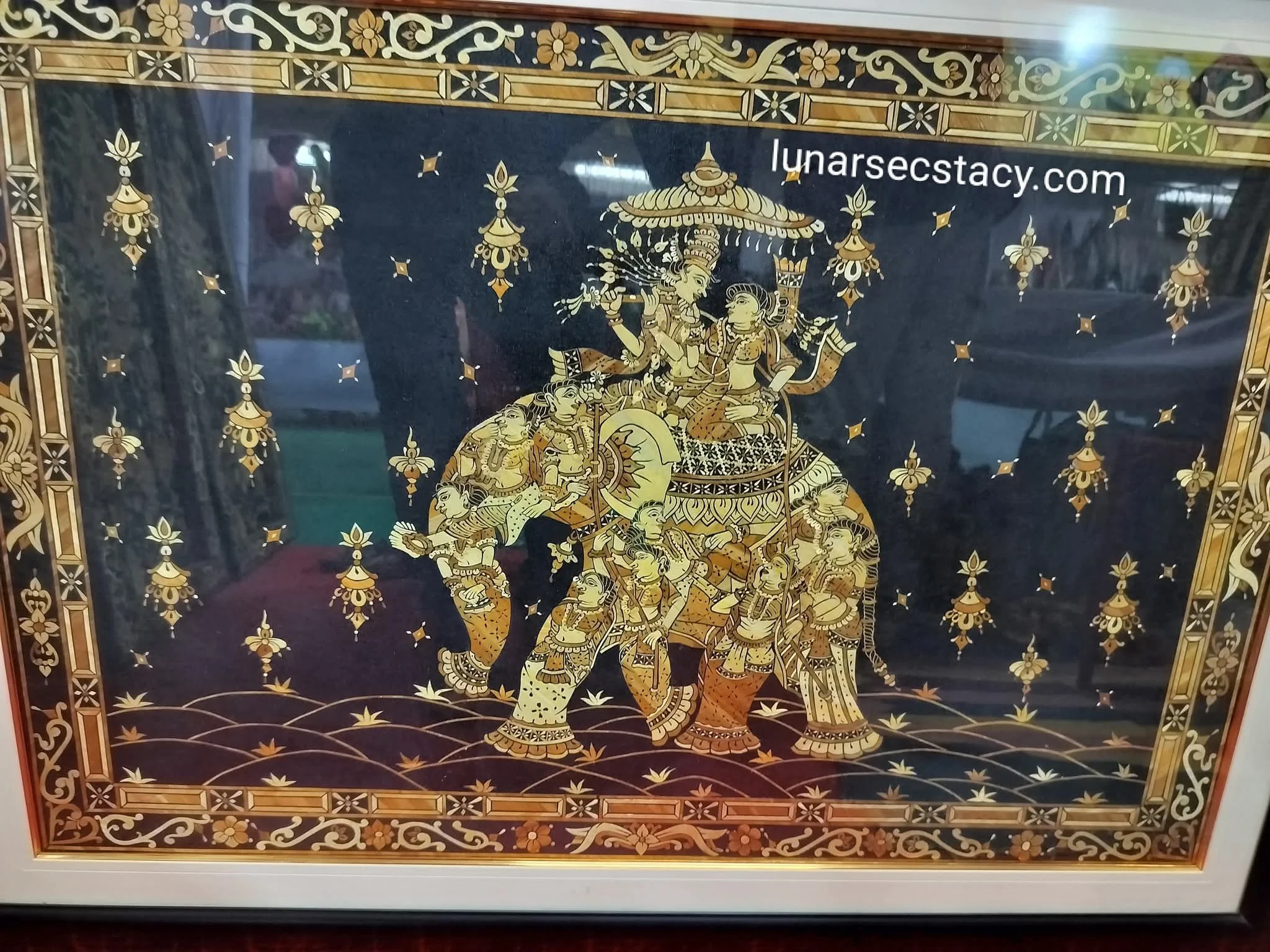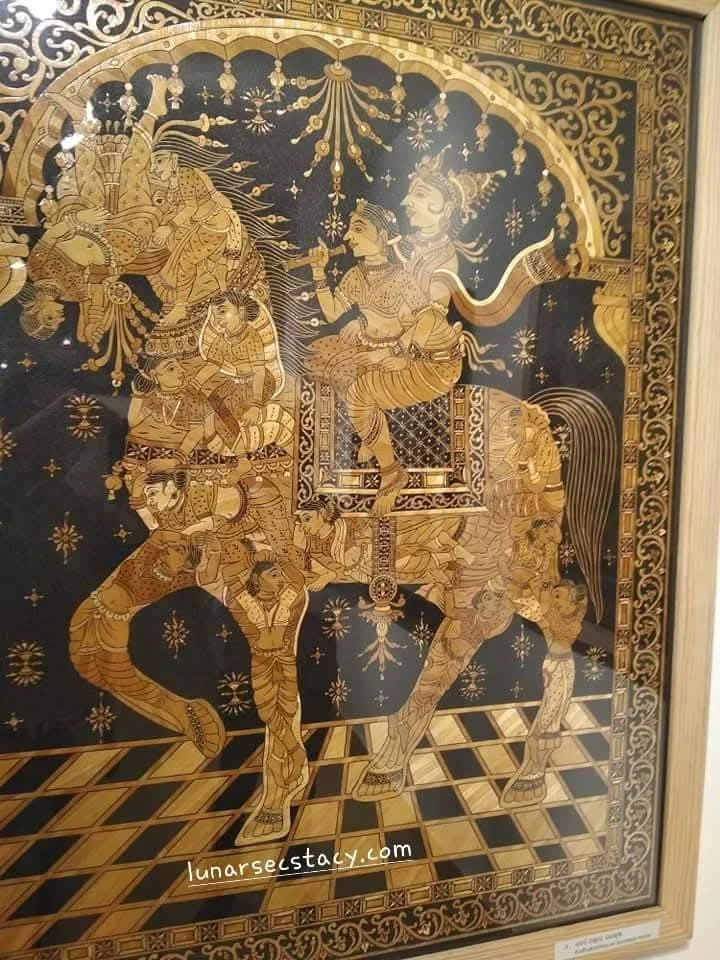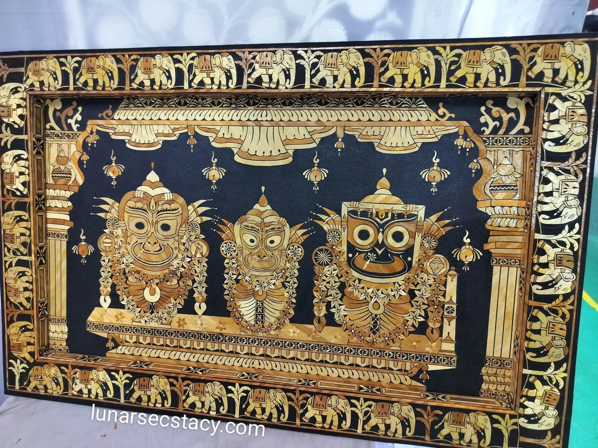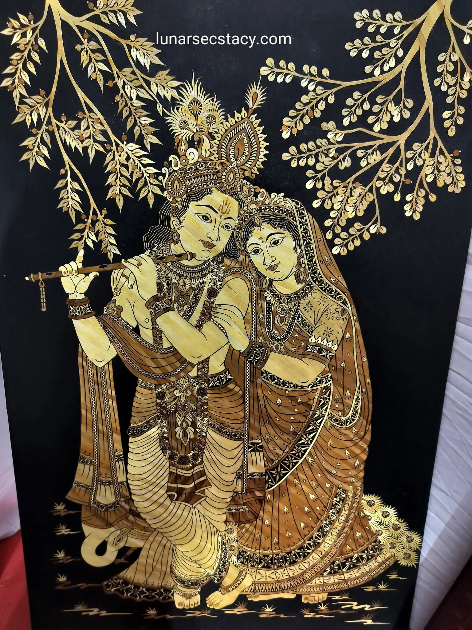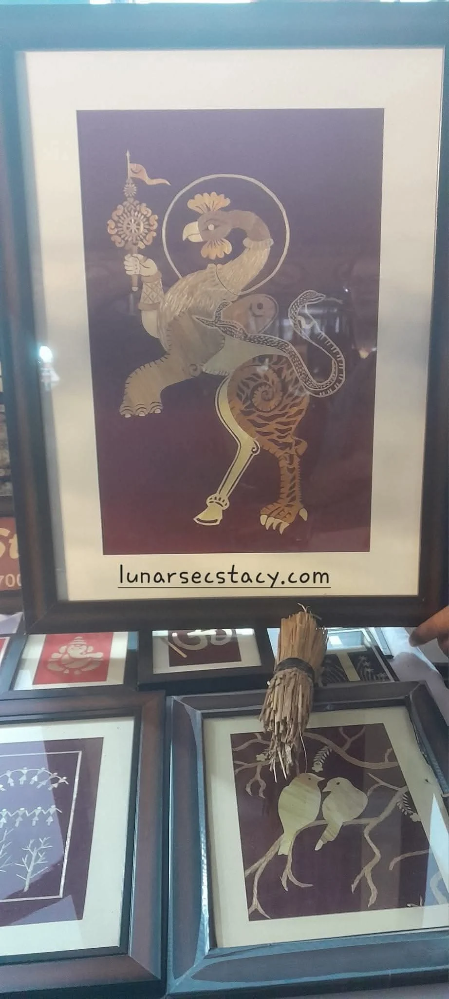 The dark coloured straws are segregated from the off-white and golden coloured straws and those are then cut precisely in different shapes and pasted usually on smooth surfaces ( usually black or red velvet clothes) . The topic is usually taken from our folklore and mythology. Here are certain photos for better understanding.