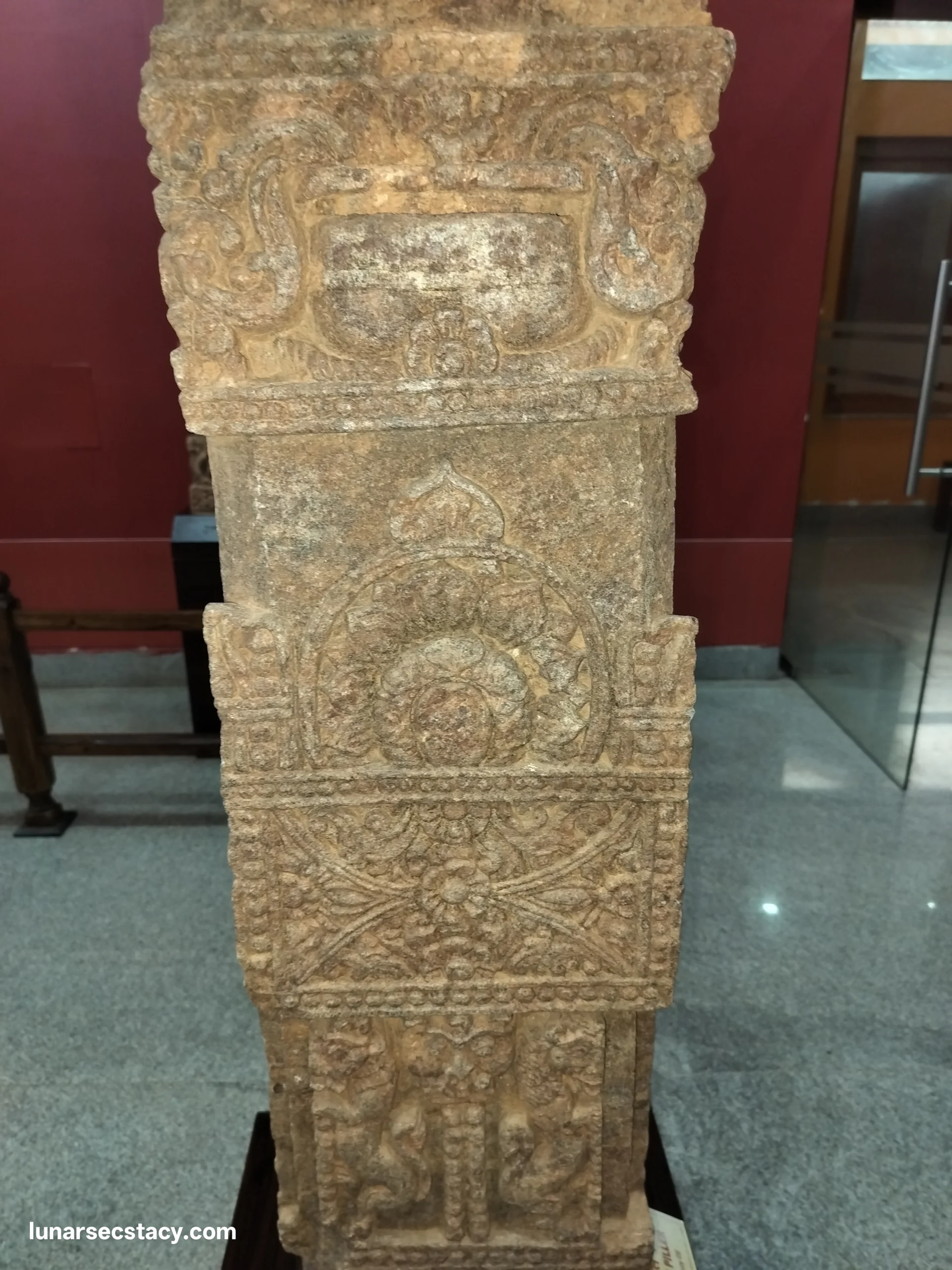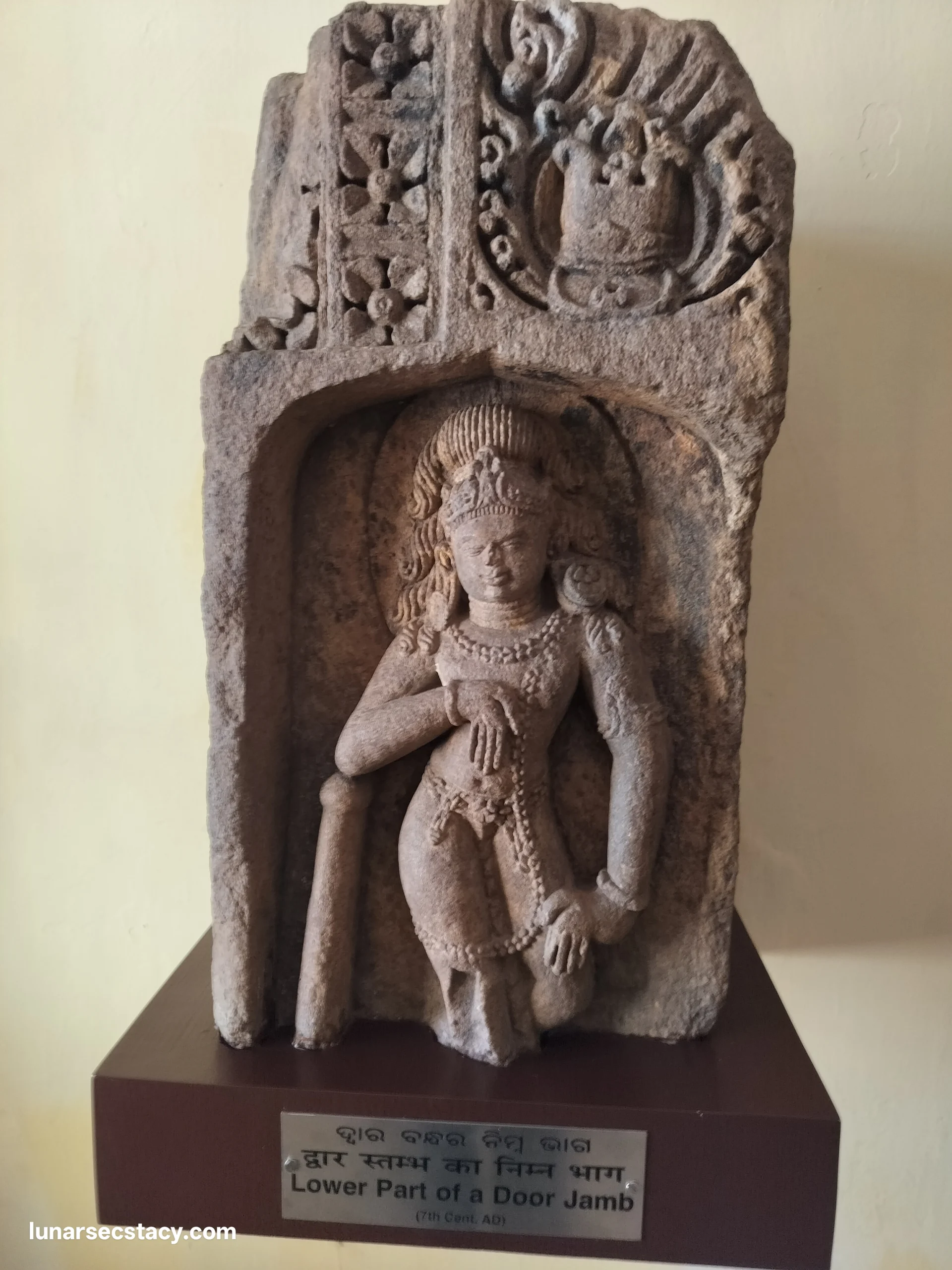 The main entrance door jamb of Ratnagiri monastery (Monastery 1) is a 9th-century masterpiece of Indian art, described by archaeologist Debala Mitra as “the loveliest entrance to a structural monastery in the whole of India”. Carved from blue-green chlorite stone, the doorway is noted for its intricate, three-layered design featuring floral scrolls, foliage, and figures like the Goddess Yamuna. Here I have given the photo of the said entrance door jamb.
